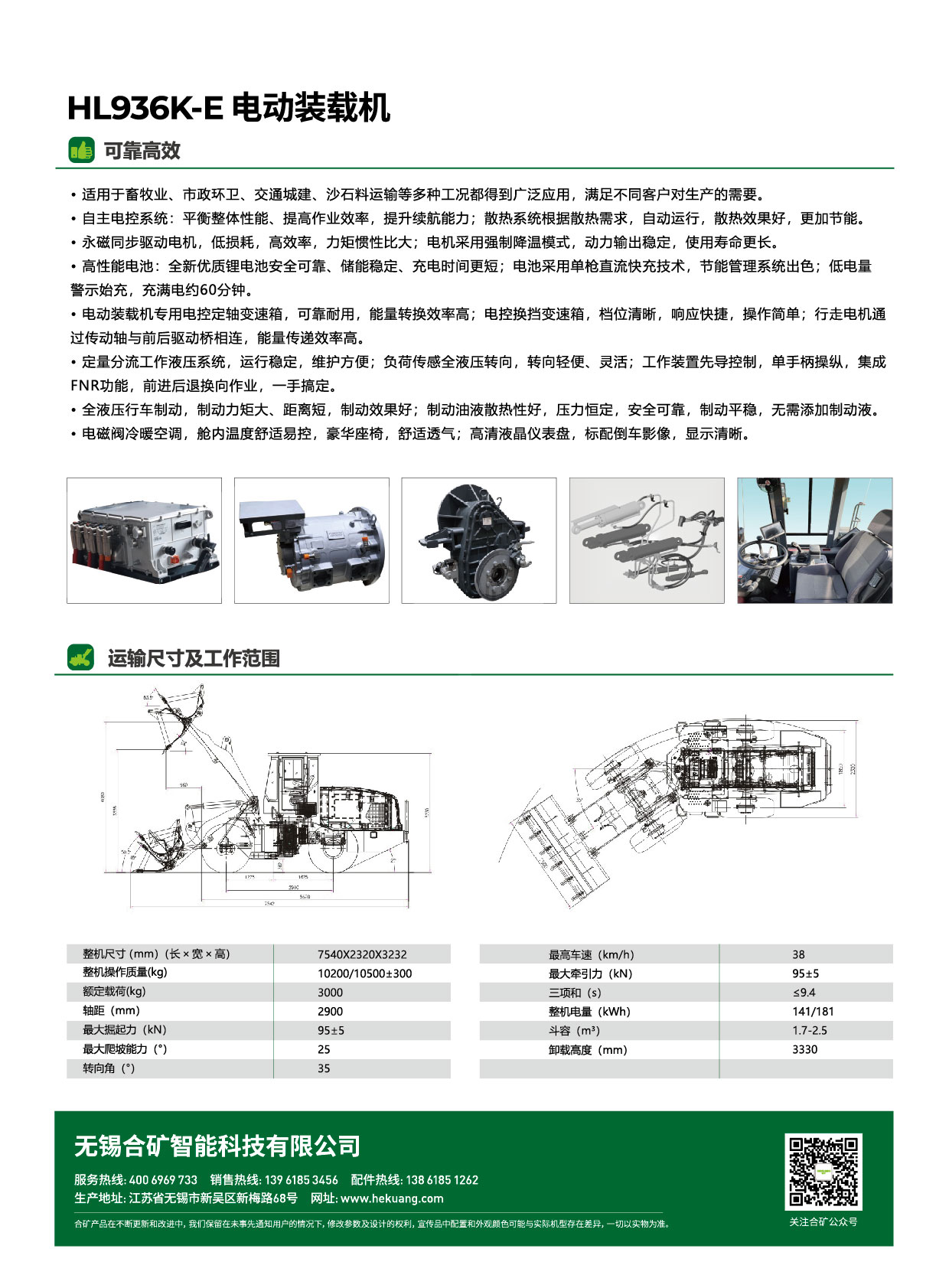 额定载荷 3000kg,铲斗容量 1.7-2.5m³,配备 141/181kWh 锂电池;整机尺寸 7540×2320×3232mm,操作质量 10200/10500±300kg,轴距 2900mm。最大掘起力 95±5kN,最大爬坡 25°,转向角 35°,最高车速 38km/h,卸载高度 3330mm,多场景作业性能出众。