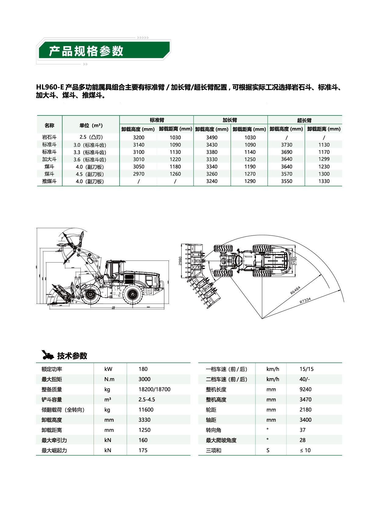额定功率 180kW,最大扭矩 3000N.m,整备质量 18200/18700kg,铲斗容量 2.5-4.5m³,作业装载灵活适配不同物料需求;倾翻载荷(全转向)11600kg,卸载高度 3330mm,卸载距离 1250mm,铲装、卸料高效适配各类作业场景。最大牵引力 160kN,最大掘起力 175kN,动力强劲,轻松应对重载荷、高阻力作业工况。